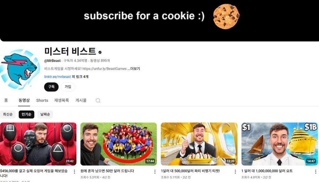 미스터비스트(MrBeast)는 초창기 유튜브 수익을 전부 더 큰 영상 제작 예산에 재투자하며 채널을 성장시켰습니다. 현재는 단일 영상당 제작비가 수억~수십억 원에 달할 정도로 스케일이 커졌으며, 10초 광고 단가가 약 40억 원으로 추정됩니다. 이러한 투자 구조 덕분에 ‘지출→조회수 상승→광고 및 후원 증가→제작비 증액’의 선순환이 이어졌습니다.