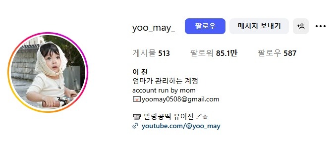 카더가든 유튜브 채널에 출연한 이진의 본명은 유이진이며 인스타그램 계정은 “@yoo_may_”입니다. “엄마가 관리하는 계정, 말랑콩떡 유이진”이라고 인스타그램 계정 설명란에 적혀 있습니다. 계정에는 유이진의 일상 사진과 동영상 등 다양한 콘텐츠가 올라와 있죠. 이진이의 인스타그램 팔로워 수는 약 85만1천 명이고 유튜브 채널 《말랑콩떡 유이진》 구독자 수는 약 18만7천 명입니다.
